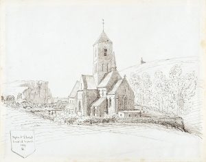 BEAUCHESNE Alcide, Vicomte de (1804-1873).Etretat : l'Église, Les aiguilles d'Etretat, Le poste de la douane, La maison Gratien. Ensemble de six dessins à la mine de plomb, certains signés de son monogramme, identifiés et datés de 1857....