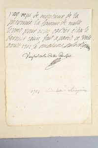 LESDIGUIERE Paule-Marguerite de Gondi, duchesse de (1655-1716). Lettre autographe signée La duchesse de Lesdiguiere, adressée à Monsieur de la ..., le 16 août 1701, 1 page, in-folio. Bon état.