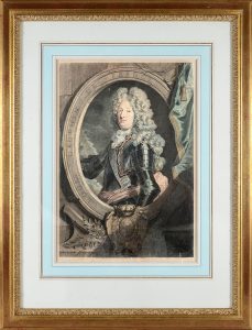 LOUIS, prince de France, dit le Grand Dauphin, fils du roi Louis XIV (1661-1711). Gravure signée F. Drewet, d'après un portrait peint par Hyacinthe Rigaud, publiée à Paris chez Bligny, le représentant en armure, ornée au bas du document du...