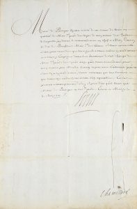 « Mons. de Puységur ayant résolu de me servir . en qualité de Mar.al général des logis de mon armée de Flandres de laquelle j'ai donné le commandement en chef à Mon Cousin le duc de Boufflers Mar.al général de France. Je vous escris cette lettre pour vous dire que vous ayez avoir rendu en ma dite armée ou vous y employez dans les fonctions de la dite charge de Mar.al général des logis ainsi qu'il vous sera donné pour mon service par Mon dit Cousin ou par mes lieutenants généraux pour luy près ma dite armée, vous assurant que les services que vous m'y rendrez me seront bien agréables. En la présente . je prie Dieu qu'il vous aye Mons. de Puységur en Sa Ste garde. Escrit à Marly le 6 juin 1701. LOUIS ».