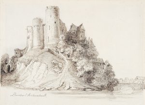 BEAUCHESNE Alcide Vicomte de (1804-1873). Vue du château de la Maison de Bourbon l'Archambault. Ensemble de quatre dessins à l'encre brune et noire, datant de 1850. A vue : 21 cm - L. : 27 cm.