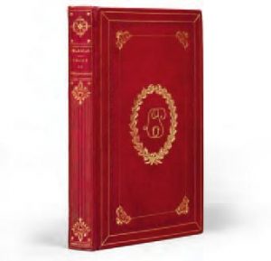 imitant le tabis, roulette intérieure dorée. Bel exemple de plaque « à la cathédrale » sur un portefeuille commercialisé sous le nom d’alphonse Giroux. Marchand papetier, tabletier et ébéniste, la maison Giroux ne possédait pas d’atelier de reliure, mais proposait à ses clients un large choix d’objets de luxe, cadeaux, jouets, albums à dessins ou portefeuilles… Somptueusement reliés et parfois mosaïqués par les meilleurs artisans, ils étaient vendus par alphonse Giroux sous son nom, celui-ci y faisant apposer sa signature ou son étiquette. Louis XVIII et charles X y acquirent à l’occasion des présents destinés aux enfants de France. Il contient un cahier de papier buvard, couvert du même papier moiré amarante portant l’étiquette a. Giroux & cie, rue du coq-Saint-Honoré, n°7, à Paris. Dimensions : 309 x 226 mm. Provenance : chiffre T. c., non identifié. Exposition : culot (P.), Relieurs et reliures décorées en France à l’époque romantique, Bibliotheca Wittockiana, 7 oct. 1995-20 janv. 1996, Bruxelles, n°2, avec reproduction (le plat inférieur du portefeuille a aussi fait l’objet de la couverture du catalogue). culot (P.), Relieurs et reliures décorées en France à l’époque romantique, Bibliotheca Wittockiana, 1995, pp. 511-512 et pl. VIII (notice sur alphonse Giroux).