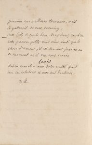 « Je ne peux sortir, ma chère Lamballe sans vous avoir écrite, votre lettre m'a fait trop de plaisir, j'y vois trop votre amitié. Je suis bien triste et affligée, le désordre ne cesse point, je vois l'audace s'augmenter chez nos ennemis et le courage diminué chez les honnêtes gens, on ne peut penser qu'au jour le jour avec la crainte des lendemains. [...] Ma fille se porte bien, vous savez combien cette pauvre petite vous aime ainsi que le chou d'amour, il est sur mes jenoux en ce moment et il veu vous écrire LOUIS. Adieu mon cher cœur votre amitié fait ma consolation et mon seul bonheur. Ce 4 ».