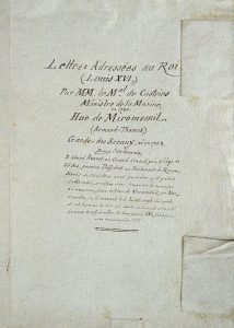 Dans cette correspondance, le ministre informe et conseil le roi sur les différentes affaires du royaume tout en lui faisait part de ses observations. Historique : Hue de Miromesnil Armand-Thomas, fut Ministre de la Marine en 1780, Garde des Sceaux, né en 1723, dans l'Orléanais, d'abord Avocat au Grand Conseil, puis à l'âge de 26 ans, premier Président au Parlement de Rouen, sortit du ministère aussi peu riche qu'il y était jadis entré, se retira sans demander la moindre récompense, dans sa terre de Miromesnil, en Normandie, où il mourut le 5 Juillet 1796. La perte de cet homme de bien qui avait noblement secondé les vues bienfaisantes du bon Louis XVI, fut à peine remarquée ! ! ! - 9 octobre 1785 : « Sire, M. de Crosne m'a rendu compte à Paris, d'une affaire qui intéresse l'administration que vous m'avez confié, je n'en ferai pas un grand détail dans cette lettre, parce qu'il m'a dit que M. le Baron de Breteuil à qui il en a aussi fait part, a dû en rendre compte à Votre Majesté. Le Sr Le maître qui a été arrêté avant-hier à la Barrière du Temple et chez lequel on a trouvé la source des libelles qui paraissent depuis quatre ans, était avocat au Parlement de Rouen. Il était ensuite venu s'établie à Paris, ayant rendu quelques services à Rouen à M. de Montbarrey, il avait accepté les charges de secrétaire du Roy et de Greffier du Conseil des Finances de M. de Vougny. J'ai vu une partie du mauvais écrit que M. de Crosne a trouvé sur lui et que ce Magistrat m'a fait voir. On y a aussi trouvé tous les ustensiles nécessaires pour l'imprimer, et lorsqu'il a été arrêté à la Barrière du Temple il portait une planche d'imprimerie toute composée, et qu'il a laissé tomber afin qu'elle se rompit. Je prends Sire la liberté de vous proposer de donner ordre de le transférer au Châtelet, et d'ordonner à M. de Crosne de remettre au Procureur du Roy du Châtelet tous les procès verbaux et les interrogatoires, avec les libelles et papiers saisis, afin qu'on lui fasse son procès ainsi qu'à ses complices et adhérents. C'est l'unique moyen de tarir la source des écrits infâmes dons on inonde le public. Je suis avec le plus profond respect, Sire, De Votre Majesté, Le très humble, très obéissant, très fidèle et très soumis Serviteur et Sujet, Miromesnil. » - 28 octobre 1785 : « Sire, M. le Premier Président m'a mandé que les Chambres ont été assemblées ce matin. L'on a arrêté que le procès verbal de ce qui s'est passé Vendredi 23 de ce mois serait rédigé et apporté à l'assemblée des Chambres Vendredi prochain pour y délibérer. Il y a eu un second avis pour délibérer sur le champ. Il n'y a eu à cet avis que deux voix. Les lettres patentes pour les décrets détenus à la Bastille ont été portées ce matin par M. le Procureur Général, mais elles n'ont pu être présentées à la Grande Chambre pour être enregistrées, parce que M. Fitan a la fièvre. Il a mandé à M. le Premier Président qu'il tacherait d'aller au Palais Vendredi. M. le Premier Président me mande aussi qu'il m'enverra demain une liste de Cent des Messieurs de la Grande Chambre qu'il pense être le plus en état de remplir les fonctions de rapporteur des affaires de Votre Majesté. Je supplie Votre Majesté de permettre que j'aille à Paris demain pour quelques affaires de famille que j'y ai. Je reviendrai Vendredi matin. Je tacherai aussi de voir M. le Premier Président, et je vous rendrai compte de ce qu'il m'aura dit. Je suis avec le plus profond respect. » - 2 février 1786 : « Sire, J'ai eu l'honneur de remettre Dimanche dernier à Votre Majesté, un libelle imprimé, intitulé, Recueil de Pièces authentiques et intéressantes pour servir d'éclaircissement dans l'affaire concernant le Cardinal de Rohan. Depuis huit jours ce libelle se vend avec profusion, au Palais Royal, aux Tuileries au Palais, et en différents endroits, quoique le Lieutenant de Police en ait fait saisir chez plusieurs Marchands de livres. Il se vendait d'abord 48 sols, ensuite on l'a donné pour 36 sols, enfin il est à 24 sols, et l'on en a autant que l'on en veut. M. de Crosne m'a informé hier de la découverte qu'il a faite d'un autre Libelle imprimé intitulé lettre d'un Garde du Roy pour servir de suite à Cagliostro. Nous avons découvert que c'est le même colporteur qui fait distribuer la lettre d'un Garde du Roi de concert avec un nommé Manuel qui a déclaré aux officiers de Police en être l'Editeur et non l'auteur. J'ai dit a M. de Crosne de faire arrêter Desanges Père et Manuel, et de saisir leurs papiers et les imprimés qui se trouveraient chez eux, et même s'il le fallait le fils de Desanges qui est Libraire et connu pour vendre des livres défendus. Il a désiré que je lui écrivisse pour cela, et je lui ai écrit. Je rendrai compte à Votre Majesté de la suite de cette affaire » -9 avril 1787 : « Sire, J'obéis à l'ordre de Votre Majesté. Je viens de remettre à Monsieur de Montmorin, les Sceaux, et je supplie Votre Majesté d'agréer ma démission de la charge de Chancelier de France que vous aviez réunie à celle de garde des Sceaux, lorsque vous daignerez m'en honorer. Je vous ai servi Sire par attachement pour votre Personne, et sans autre intérêt que celui du bien et de votre service. Le reste de ma vie sera employé à faire des vœux pour la prospérité de Votre Règne. Je remets entre vos mains avec confiance, mon sort et celui de ma famille ». - 9 avril 1787 : « Je supplie très humblement le Roi de vouloir bien recevoir l'hommage de la Démission que je fais dans ses mains de sa Majesté, de l'état et office de Garde des Sceaux de France, crée par Edit du mois d'août mille sept cent soixante et quatorze, et de l'Etat et office de Chancelier de France que Sa Majesté avait réuny par le même Edit à celui de Garde des Sceaux de France à Paris le neuf avril mille sept cent quatre-vingt-sept. Hue de Miromesnil ».