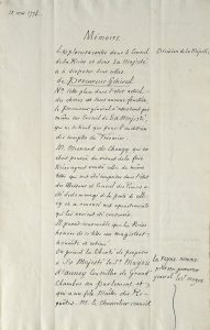 « .. Les places vacantes dans le Conseil de la Reine et dont sa majesté à disposer sous celles de Procureur Général Nota Cette place dans l'état actuel des choses est sans aucune fonction, le Procureur général n'assistant pas même au Conseil de sa Majesté, qui ne se tient que pour l'audition des comptes du Trésorier. M. Mesnard de Chouzy qui en était pourvu du vivant de feue la Reine ayant vendu celles du même Titre qui ont été comprises dans l'état des Maisons et Conseil des Princes a été dédommagé de la perte de celle-ci et a renoncé aux appointements qui lui avoient été conservés. Il parait convenable que la Reine honore de ce titre un magistrat honnête et estimé. On prend la liberté de proposer à sa Majesté le Sr Mayou d'Aulnoy Conseiller de Grand' Chambre au Parlement [la Reyne nomme pour son procureur général le Sr Mayou] et qui a un fils Maitre des Requêtes. M. le Chancelier connait et estime ces magistrats, et je peux répondre de leur naissance qui est très honnête et de leurs vertus. La place d'Avocat Général de sa majesté. Cette place n'a pas plus de fonctions que la précédente. Le Sr Charbonnier de la Robolle qui la possédait, en a été dédommagé par celle pareille qu'il a obtenue gratuitement chez m. le Comte d'Artois. Le Sr Brunet avocat aux Conseils très employé et estimé, a été recommandé à Sa Majesté par mad. La Comtesse de Noailles et mad. la Duchesse de Durfort. Il a été Intendant de l'ordre de St Lazare et en porte la croix. Le Sr Desirat Conseiller de Grand' Chambre au parlement, fils d'un avocat de Toulouse très estimé demande la même place. Enfin elle est demandée par le Sr Lelarge, avocat, frère