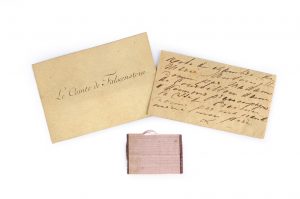 MARIE-ANTOINETTE, reine de France. Fragment d'un morceau de fil du drap dans lequel l'on fit coucher la reine durant sa captivité à la prison du Temple, appliqué sur parchemin et surmonté d'un blason dessiné à l'encre représentant ses armes....