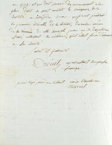 « Illustre patriote et ancien ami, je viens de recevoir les deux médailles que tu m'a envoyé dernièrement et qui doivent perpétuer à jamais chez mes descendants l'amour des vertus républicaines et la haine de . qui a toujours caractérisé les vrais patriotes de 89. [.] Elles vont être placées avec soin auprès de celles que tu me donnas en 1793, ce qui doit servir de monument à la gloire dont se sont couverts les vainqueurs de la Bastille, ces intrépides héros qui firent jaillir les premières étincelles de la liberté du rocher même de la tyrannie, de cette horrible prison, où le despotisme effrayé entassait les victimes qu'il était forcé d'immoler à sa sûreté ». Historique : Drouet fut en charge d'arrêter le roi Louis XVI lors de sa fuite à Varennes. Cette lettre fut rédigée trois mois avant la découverte de la conspiration de Babeuf, dans laquelle Drouet fut impliqué.