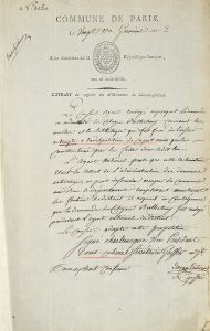 Historique : Concernant les démarches entreprises après la Révolution, par Barthélémy, ancien habitant de la Tour du Temple, afin de récupérer ses effets personnels, ses meubles et les livres de sa bibliothèque. « Le conseil ayant renvoyé au parquet la demande en indemnité du citoyen Barthélémy concernant les meubles et la bibliothèque qu'il fut forcé de laisser au temple à la disposition de Capet ainsi que les construction par lui faite dans ledit lieu. L'agent national pense que cette réclamation étant du ressort de l'administration des domaines nationaux, ne peut désormais occuper la commune mais bien le département remplissant maintenant les fonctions de district il requiert en conséquence que la demande du citoyen Barthélémy soit renvoyé pardevant l'agent national du district. Le conseil adopte cette proposition. . Charlemagne vice-président ; Dorat-Cubières secrétaire greffier adjt ».