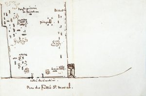LOUIS-CHARLES, prince de France, duc de Normandie, Louis XVII (1785-1795). Croquis et annotations manuscrites faites par le Vicomte Alcide de Beauchesne désignant l'emplacement de la tombe de Louis XVII dans le cimetière situé rue des Fossés St...