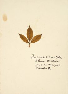 L0UIS-CHARLES, prince de France, duc de Normandie, Louis XVII (1785-1795). Emouvants souvenirs provenant de la tombe de Louis XVII : trois feuilles d'arbre ramassées et collées par le Vicomte Alcide de Beauchesne., avec inscription manuscrite de la...