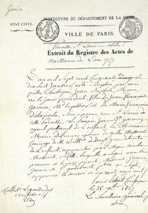 (...) après avoir pris connaissance de mon ouvrage sur cet infortuné prince ». Cette pièce fut utilisée comme document dans l'ouvrage écrit par Beauchesne sur la famille royale et Louis XVII. On y joint la copie manuscrite de l'acte de naissance de Gomin, extrait du registre des actes de naissance de l'An 1757 de la paroisse Saint Louis en l'Ile, établi le 26 octobre 1827, avec cachet à sec aux armes de France de la Préfecture de la Seine. La minute de la lettre de Madame Gomin, remettant en souvenir de son mari, les éléments suivants : 1°) le récit de Madame Royale indiquant les portes de Paris à Huningue, 2°) la relation du voyage fait par Madame Royale écrite de sa main, 3°) deux pièces en vers composées par Madame Royale dans la prison du Temple, 4°) un mot d'audience pour Gomin de la main de Madame Royale, 5°) des cheveux du roi, de la reine, de Madame Royale et de Louis XVII. Et le brouillon de la lettre écrite par le Vicomte de Beauchesne à la veuve de Gomin en remerciement des souvenirs ayant appartenu à la famille royale, précieusement conservés par Gomin qu'elle lui fit remettre en souvenirs de son défunt mari. : « Je suis profondément touché de la preuve de confiance et d'estime dont vous m'avez honoré, en me léguant ces précieuses reliques...je me ferais un devoir de les conserver entre mes mains...conformément à vos instructions et celles de M. Gomin, Paris, le 3 juin 1841 », il précise au dos de ce document : « que cette date est le jour de la réception de V. Hugo à l'Académie .... »