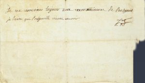 « Je me souviens toujours avec reconnaissance de Fontgerville. Je désire que Fontgerville vienne me voir ». Provenance : collection Jean-Baptiste Gomin (1757-1841), remis à son décès par sa veuve le 2 juin 1841, au Vicomte Alcide de Beauchesne. Comme le précise la lettre qui accompagne ce document : « Sachant combien M. Gomin avait d'affection pour vous, je suis sûre de rendre hommage à sa mémoire et de remplir en quelques sorte ses intentions en vous léguant en son nom les papiers ci-joints auxquels il attachait un prix si grand et si légitime : - 1°) un écrit de Madame Royale indiquant les postes de Paris à Huningue ; 2°) la relation du voyage faite par S.A.R. et écrite également de sa main. 3°) Deux pièces de vers composées par Madame dans la Tour du Temple et écrites de la main de S.A.R. 4°) un mot d'audience pour M. Gomin de la main de Madame. 5°) Des cheveux du Roi, de la Reine, de Madame Royale, et de Louis XVII. Veuillez recevoir, Monsieur, et conserver ce legs comme le souvenir et conserver ce legs comme un souvenir de mon excellent mari, et comme un témoignage de la haute estime avec laquelle j'ai l'honneur d'être, votre très humble et servante très affectionnée, Pontoise, le 2 juin 1841 ». Au dos, le Vicomte a noté des informations biographiques sur M. Gomin. Puis collection du Vicomte Alcide-Hyacinthe du Bois de Beauchesne (1804-1873).
