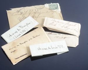 MARIE-THERESE, princesse de France, Madame Royale (1778-1851). Petite enveloppe pliée contenant des mèches de cheveux ayant appartenu à la fille du roi Louis XVI et de la reine Marie-Antoinette de France, sur laquelle est inscrit à l'encre : «...