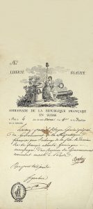 « Laissez passer le citoyen Gomin préposé du gouvernement de la République française pour l'échange de la fille du dernier roi des français allant à Huningue. Accompagné d'un courrier du gouvernement revenant en suite à Bâle ». Provenance : collection Jean-Baptiste Gomin (1757-1841), puis collection du Vicomte Alcide-Hyacinthe du Bois de Beauchesne (1804-1873).
