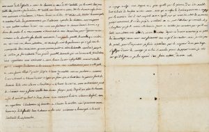 « Je suis sortie du temple le 19 décembre à 11 heures et demi du soir sans être aperçue de personne à la porte de la rue j'ai trouvé Mr ... La rue du temple était déserte il n'y avait pas homme attaché à Mr. ... il m'a donné le bras et nous avons été à pied jusqu'à la rue Mélée là nous avons rencontré sa voiture où je suis monté avec lui et Mr Gomin nous avons fait plusieurs tours dans les rues et enfin nous sommes arrivés sur les boulevards devant l'opéra ou nous trouvâmes la voiture de poste avec Mme ... et Mr Méchin officier de gendarmerie j'y suis monté avec Mr Gomin, Mr Benezech, nous a laissés aux portes de Paris on nous a demandé notre passeport à Charenton la première porte, on n'a pas voulu d'assignats des postillons on voulut absolument être payé en argent il n'est rien arrivé le reste de la nuit à 9 heures du matin nous sommes descendus à Gaignes pour déjeuner. On ne m'a pas reconnu et nous sommes repartis à 10 heures. Nous eûmes des chevaux assez facilement sur les deux. j'ai été reconnu à la poste de Provins il y a eu du monde qui s'est assemblé près de la voiture nous sommes partis mais un officier de dragons nous a suivis à cheval à Nogent sur Seine la porte d'après. J'ai été reconnue par la femme d'auberge où nous étions descendus, elle me traita avec beaucoup de respect. La cour et la rue se remplirent de monde nous remontâmes en voiture, on s'attendrit en me voyant et on me donna mille bénédictions nous allâmes de là à grai où la maitresse nous dit que le courrier de l'ambassadeur de ... Mr Carletti lui avait dit que je devais passer par là et que j'avais deux voitures nous arrivâmes a grai à onze heures nous y soupâmes et nous y couchâmes nous en partîmes le lendemain 20 décembre à 6 heures du matin à la poste d'après Troyes nous eûmes de la difficulté à avoir des chevaux à cause de Mr Carletti qui les avait tous pris toute la ... Mr Carletti nous devançait et avait tous les chevaux enfin le soir nous arrivâmes à ... à 8 heures du soir ou il était. Mr Méchin alla trouver la municipalité et à montrer l'ordre du gouvernement qui l'autorisait à prendre des chevaux nous soupâmes et nous partîmes à 11 heures du soir. Nous eûmes assez facilement des chevaux durant la nuit. A 9 heures du matin le 21 nous arrivâmes a Chaumont où nous descendîmes pour déjeuner on me reconnut et la chambre fut bientôt environnée d'une grande quantité de monde qui voulais me voir ; mais avec bonne intention. Mr Méchin fit venir la gendarmerie qui n'y fit rien la municipalité étant venue assurer que nous pouvions partie et calma le tumulte. Cependant jusqu'à la voiture je fus entourée d'une grande quantité de monde qui me donna mille bénédictions nous repartîmes nous arrivâmes a onze heures du soir à ... souvent retardés par le manque de chevaux et les mauvais chemins, nous n'en trouvâmes point à cette porte et nous fumes obligés d'y rester jusqu'à 6 heures du matin. Nous en partîmes et arrivâmes le soir à Vesoul à 8 heures du soir. N'ayant pu faire que 10 heures dans la journée faute de chevaux de là nous allâmes à Montchamp à 4 heures du soir où nous ne trouvâmes point de chevaux nous fumes arrêtés deux heures. ... porte d'après pas plus de chevaux enfin il en vint au bout de deux heures. Nous arrivâmes le soir à 11 heures à Belfort nous en repartîmes le lendemain 24 décembre à 6 heures du matin nous éprouvâmes encore beaucoup de difficultés dans le chemin enfin nous arrivâmes à ... à la nuit tombante le 24 décembre. Ce voyage malgré mon chagrin m'a paru agréable par la présence d'un être sensible dont la bonté ... longtemps m'était connu mais qui en a fait la dernière preuve en ce voyage par la manière dont il s'est comporté à mon égard par sa manière active de me servir quoiqu'assurément il ne dû pas être accoutumé. On ne peut l'attribuer qu'a son zèle il y a longtemps que je le connais cette dernière preuve ne m'était pas nécessaire pour qu'il eut toute mon estime mais il l'a encore davantage depuis ces derniers moments je ne peux dire davantage mon cœur sent fortement tout ce qu'il doit sentir ; mais je n'ai pas de parole pour l'exprimer. Je finis cependant par le conjurer de ne pas trop s'affliger d'avoir du courage je ne lui demande point de penser à moi je suis sûr qu'il le fera et je lui réponds d'en faire autant de mon côté ». Provenance : cette pièce fut remise par la princesse à Jean-Baptiste Gomin (1757-1841) qui la porta religieusement sur lui toute sa vie dans un sachet et qui fut remis à son décès par sa veuve le 2 juin 1841, au Vicomte Alcide de Beauchesne. Comme le précise la lettre qui accompagne ce document : « Sachant combien M. Gomin avait d'affection pour vous, je suis sûre de rendre hommage à sa mémoire et de remplir en quelques sorte ses intentions en vous léguant en son nom les papiers ci-joints auxquels il attachait un prix si grand et si légitime : - 1°) un écrit de Madame Royale indiquant les postes de Paris à Huningue ; 2°) la relation du voyage faite par S.A.R. et écrite également de sa main. 3°) Deux pièces de vers composées par Madame dans la Tour du Temple et écrites de la main de S.A.R. 4°) un mot d'audience pour M. Gomin de la main de Madame. 5°) Des cheveux du Roi, de la Reine, de Madame Royale, et de Louis XVII. Veuillez recevoir, Monsieur, et conserver ce legs comme le souvenir et conserver ce legs comme un souvenir de mon excellent mari, et comme un témoignage de la haute estime avec laquelle j'ai l'honneur d'être, votre très humble et servante très affectionnée, Pontoise, le 2 juin 1841 ». Au dos, le Vicomte a noté des informations biographiques sur M. Gomin. Puis collection du Vicomte Alcide-Hyacinthe du Bois de Beauchesne (1804-1873). Présentation : lors de l'exposition Louis XVII organisée par le Musée Lambinet à l'Hôtel de Ville de Versailles de mai à juill
