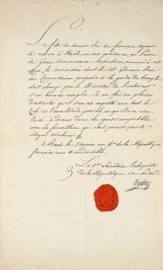 « La fille du dernier Roi des français ayant été remise à Basle, en ma présence, au Prince de Garre commissaire Autrichien, nommé à cet effet, la commission dont le citoyen Gomin l'un des commissaires préposés à la garde du temple était chargé par le Ministre de l'intérieur s'est trouvée remplie. Je me fais un plaisir d'attester qu'il s'en est acquitté avec tout le zèle et l'exactitude possible et qu'il n'a rien laissé à désirer dans les égards compatibles avec la surveillance qui était prescrite par le citoyen Méchain. Le 1er secrétaire interprète de la République en Suisse. Bacher ». Historique : Bacher fut chargé par le gouvernement de la République Française de négocier l'échange des militaires français faits prisonniers par les troupes autrichiennes contre la fille du roi Louis XVI, la princesse Marie-Thérèse de France, à Bâle, le 26 décembre 1795. Provenance : collection de Jean-Baptiste Gomin (1757-1841), puis collection du Vicomte Alcide-Hyacinthe du Bois de Beauchesne (1804-1873).