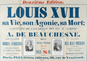 BEAUCHESNE Alcide Vicomte de (1804-1876). Louis XVII, sa vie, son agonie, sa mort ; captivité de la famille royale au temple, affiche promotionnelle publiée par la Librairie Plon, à l'occasion de la seconde édition, ornée de deux gravures...