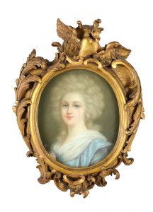 EC0LE français du XIXe siècle. D'après François Dumont (1751-1831). Portrait de Madame Elisabeth (1764-1794). Gouache, conservée dans son cadre d'origine en bois doré, ornée d'un cœur ailé. Bon état, petits accidents au cadre. A vue : H. :...