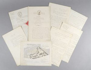 de la princesse à Montreuil-Versailles en 1787, dessinée par Emile Richard ; la copie manuscrite de la main du Vicomte de Beauchesne de la commission du 21 pluviôse de l'An II, concernant les biens de la princesse, signée par Carou; la copie manuscrite de l'extrait du registre des délibérations du comité de Versailles sur la mort du jardinier de la princesse ; la copie manuscrite de l'acte de vente du domaine de Madame Elisabeth par les domaines nationaux, les 5 et 6 mai 1802 ; la copie manuscrite datée du 27 août 1800, donnant la disposition du domaine de la princesse à la régie du domaine nationale, signée par Régnier ; la copie manuscrite du rapport fait sur l'état du jardin de la propriété d'Elisabeth Capet, en date du 4 mars 1794 ; le rapport du commissaire sur la mise à disposition des plantes du jardin d'Elisabeth Capet à Montreuil ; etc., in-folio.
