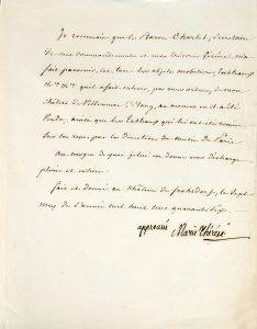 *. MARIE-THERESE, princesse de France, Madame Royale, duchesse d'Angoulême (1778-1851). Lettre manuscrite signée approuvé Marie-Thérèse, adressée au Baron Théodore Charlet (1785-1859) Château de Frohsdorf, le 7 mai 1846, in-folio. Bon état,...