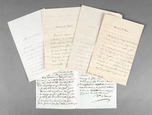 Mirecel (Frohsdorf, 19 juillet 1852), signées approuvé Marie-Thérèse, adressées au Baron Théodore Charlet (1785-1859) Château de Frohsdorf, le 7 mai 1846, in-folio. On y joint une L.A.S. du baron adressée à l'abbé Trébuquet, ainsi que deux lettres de reconnaissance pour la remise de sommes d'argent faites au nom du duc de Bordeaux, signées par Hehert, valet de pied du duc de Bordeaux.
