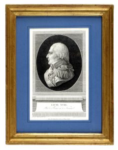 ECOLE français du XIXe siècle. Portrait du roi Louis XVIII. Gravure signée par Massard, représentant le souverain de profil la tête tournée vers la gauche, conservée sous verre dans un encadrement ancien en bois doré. Bon état. A vue : H. :...