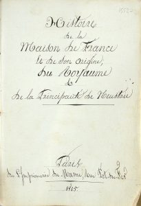 BATZ Jean-Pierre, baron de (1754-1822). Histoire de la Maison de France, de son origine du royaume et de la principauté de Neustrie, publié à Paris, chez Mame, 1815, 86 pages manuscrites, in-4°, portant au bas de la huitième page la signature...