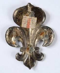 AVENEMENT DE CHARLES X. Fleur de lys en argent estampé. Travail français. Epoque : Restauration. H. : 11 cm - L. : 8, 5 cm. Poids : 11 grs.