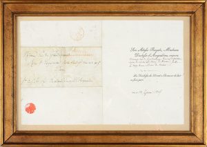de Grandchamps, Devenne, Defontaine, etc., jeudi à onze heure et demi du matin. La duchesse de Sérent a l'honneur de lui en faire part ». Avec adresse manuscrite du destinataire au dos du document, avec cachet de la poste et trace de cachet en cire rouge. Conservée dans un encadrement ancien en bois doré A vue : H. : 20 cm - L. : 31 cm. Cadre : H. : 29 cm - L. : 40 cm.
