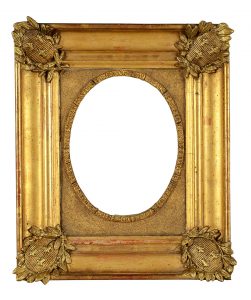 CADRE EN BOIS DORE. Orné à chaque angle d'un blason aux armes de France. Travail du XIXe siècle. Assez bon état dans l'ensemble. H. : 31 cm - L. : 26 cm.