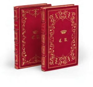 d’entrelacs formant des réserves, certaines ornées de fers à enroulement aux pointillés, dos à nerfs selon la même manière, doublure de veau glacé avec en son centre un crucifix mosaïqué de veau veiné, l’ensemble serti d’une bande de box parme, gardes de moire crème, tranches dorées (R.P. Jean Simier). Provenances : comte charles de rémusat, avec l’ex-libris de la bibliothèque du château de Lafitte et cotes de rangement, sur chacun des deux volumes ; général du Temple de rougemont (Cat., Paris, 6 déc. 2006, n°109, reproduction), avec son ex-libris. Vigeant (a.), La Bibliographie ancienne et moderne, pp. 64-65 (Pour La Théorie de l’escrime, «  Gomard mérite d’être placé en tête des maîtres français... Il faut [lui] savoir gré d’avoir osé entreprendre une revue rétrospective de son art ; la tâche était difficile, et le chapitre qu’il lui a consacré est unique et précieux pour notre école française ») ; Thimm (c.a.), A complete Bibliography of Fancing and Duelling, p. 229 ; Pardoelh, Fancing, a Bibliography, MIT, 2005, p. 153, n°1123 et 1124 ; ramsden (c.), French Bookbinders, 1789-1848, 1950, p. 104. 6 planches hors-texte gravées sur acier par Blanchard Père, J. de Mare, Gouthière, Girardet et Pelé, d’après rosenthal et Prud’hon. La première édition de la traduction de l’Imitation par Félicité de Lamennais (1782-1854) a paru chez Margueritte en 1824. Luxueuse reliure doublée qui, par son décor, rappelle les productions des XVIe et XVIIe siècles. Jean Simier a associé les entrelacs du XVIe siècle aux fers au pointillé du XVIIe. Dimensions : 262 x 167 mm. Provenances : Louis-Philippe (1773-1850), avec le timbre humide « Bibliothèque du roy à Neuilly » ; cortlandt F. Bishop (Cat. II, 1938, n°1098), avec son ex-libris ; Sir robert abdy (Cat., 1975, n°164, « Jean Simier, neveu de Simier Père »), avec son ex-libris.