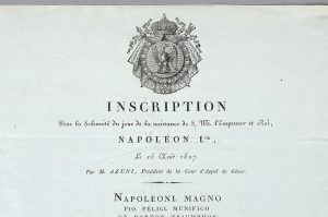 NAPOLEON Ier, empereur des Français. Affiche publiée par M. Azuni, Président de la Cour d'Appel de Gênes, intitulée « Inscription pour la solennité du jour de la naissance de S. M. l'Empereur et Roi Napoléon Ier, le 15 août 1807 ». Texte...