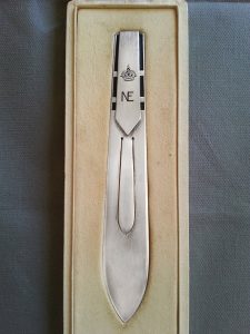 *. [EUGENIE, impératrice des Français]. Coupe papier, marque page en argent, orné du monogramme NE (Napoléon - Eugénie), sous couronne impériale, conservé dans son écrin d'origine. Travail français du début du XXe siècle, de la Maison...