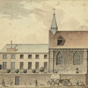 École Française du xviiième siècle Vue du côté d’une église et du bâtiment yattenant Plume et encre noire, aquarelle. 20,x 21 cm