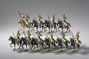 Dragons au défilé avec fusils en vedette dont Porte Drapeau. 400 / 500 166 5ème régiment de Hussards au défilé.