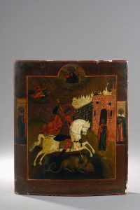 Saint Georges terrassant le dragon Tempera sur bois. Russie, xixème siècle. 36 x 30 cm Fentes et repeints.