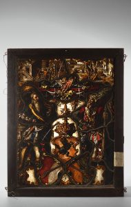 Panneau de vitrail polychrome : deux personnages encadrant un écusson armorié, dans le bas annoté Pet millésimé 1573. Allemagne, xvième siècle. Accidents. Haut. : 43,5 cm - L. : 32 cm