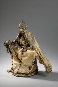 Pieta en cire, elle est présentée assise portant le Christ sur ses genoux, couronnée, voilée et habillée de soie crème brodée, l’ensemble de ses vêtements est orné de bijoux tels que collier de petites perles, barrette avec cabochon...