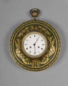 Œil de bœuf en tôle peinte à décor de pampres dorés sur fond vert. Très bon état. Époque Restauration. Diamètre : 33 cm Haut. avec l’anneau d’accrochage : 41 cm
