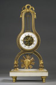 surmonté d'un vase, la base en marbre blanc à frise de perles de bronze doré pose sur quatre pieds toupie. Le mouvement squelette à quantième est signé G. Jolly à Paris, Fin du xviiième siècle. Haut. : 46 - Larg. : 21,5 - Prof. : 14 cm