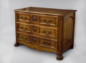 Commode en noyer clair, à façade mouvementée et moulurée d’encadrement ouvrant par trois larges tiroirs, plateau de bois, montants arrondis moulurés, pieds avant en forme de pattes de lion, poignées de tirage et entrées de serrure en bronze...