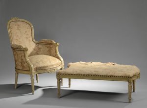Chaise longue en deux parties en hêtre mouluré et sculpté de nœuds à dossier cabriolet avec rosaces aux assemblages ; pieds ronds, fuselés, cannelés et rudentés ; relaquée couleur crème. Fin du xviiième siècle, début du xixème siècle.