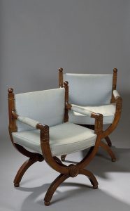 Paire de petits fauteuils curules en acajou, à dossier droit sommé de sphère, accotoirs à manchettes sculptés en léger relief de quartefeuilles et feuilles lancéolées, piètement en x réuni par une pastille sculptée de quartefeuille, patins...