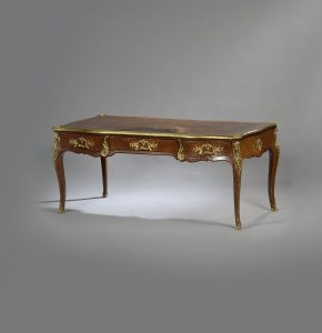 Bureau plat de placage de bois de rose et amarante, la ceinture mouvementée ouvre à trois tiroirs découpés, il pose sur quatre pieds cambrés. Plateau gainé de cuir à lingotières. Ornementation de bronze doré à feuillage telle qu’agrafes,...