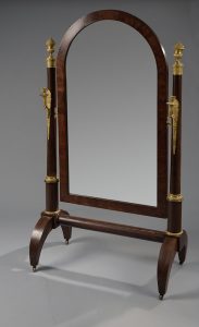 Importante psychée en acajou et placage d’acajou, présentant un miroir inclinable à fronton cintré entre deux colonnes surmontées de vases de fleurs en bronze doré. Elle pose sur des pieds en gaine arquée à roulette. Elle est ornée de deux...