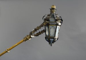 Fanal, la lanterne inclinable à pans en tôle laquée bleue et dorée à riche décor de volutes feuillagées, sommée d’une sphère doré, le manche en bois laqué ocre à bagues doré, l’arceau de fixation ornée de tôle feuillagée. Venise,...