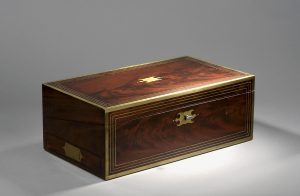 Écritoire de voyage en acajou et placage d’acajou, orné de cartouches et quadruple filets de laiton, poignées et ouvrant par un tiroir latéral. L’intérieur découvre un écritoire gaîné de velours violet, et de petits casiers. xixème...
