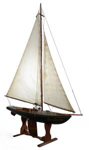 Grande maquette Sea Spray navigante de dériveur pontée bois gréement Marconni sur ber. 165 x 220 cm
