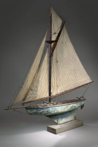 Maquette navigante en bois à quille lestée, gréement aurique, patine d’origine. 100 x 115 cm