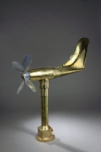 Girouette anémomètre au fuselage en cuivre, pied en laiton à hélice en aluminium avec plaque constructeur au pied. Haut. : 72 cm